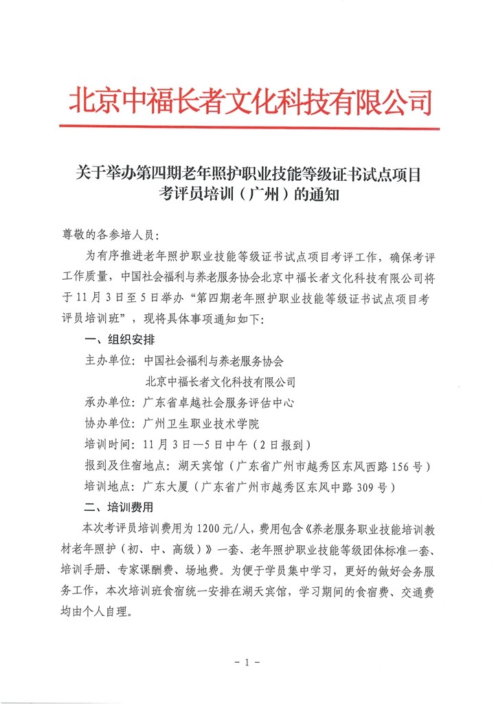 关于举办第四期老年照护职业技能等级证书试点项目考评员培训(广州)的通知